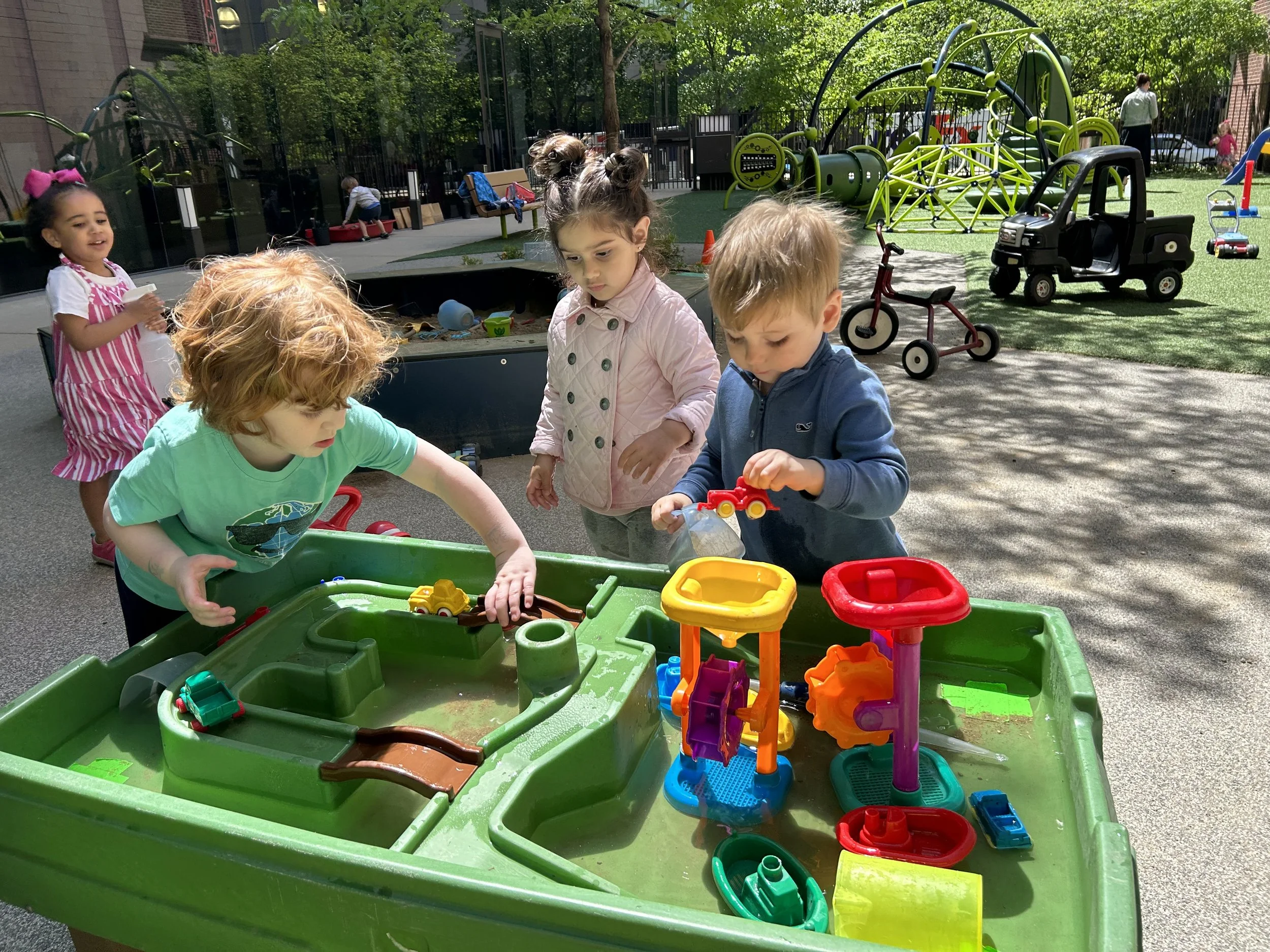 Outside, children utilize our spacious, state of the art outdoor playground to climb, run, slide, ride bikes and scooters, dig in the sand, garden and draw with chalk.