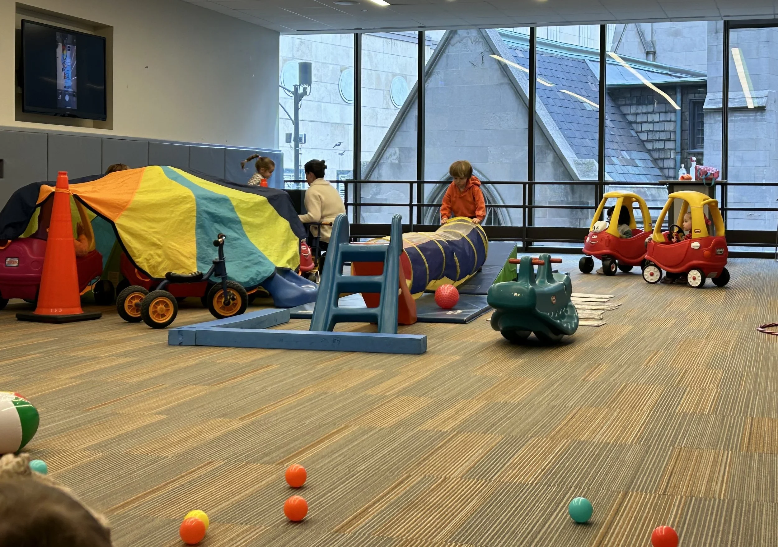 Inside, children slide, run, bike and scooter in our large, open motor room, named the Bumpus Room.